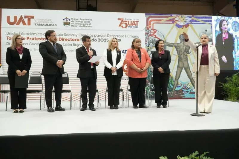 Ciudad Victoria, Tam.; 23 de septiembre de 2025.- Teniendo como testigo de honor al gobernador Américo Villarreal Anaya, el rector de la Universidad Autónoma de Tamaulipas (UAT), Dámaso Anaya Alvarado, le tomó protesta a la nueva directora de la Unidad Académica de Trabajo Social y Ciencias para el Desarrollo Humano (UATSCDH), Dra. Blanca Guadalupe Cid de León Bujanos, quien asume el cargo para el periodo 2025-2029.