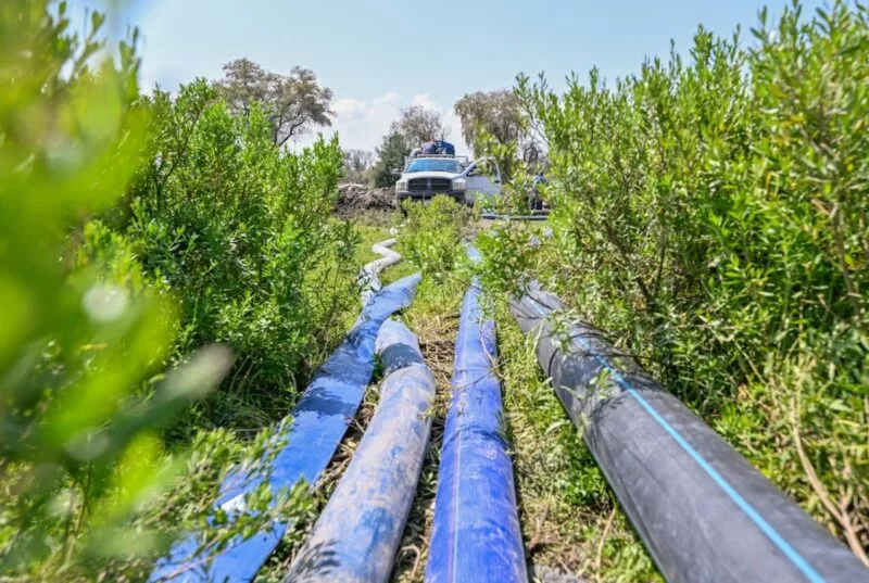LERMA, Estado de México.– El Gobierno del Estado de México instaló una bomba para retirar el agua de zonas afectadas por las intensas lluvias en San Pedro Tultepec, en el municipio de Lerma; se trata de un equipo Goliath con capacidad para desalojar mil 500 litros por segundo hacia el Río Ocoyoacac, que conecta con el Río Lerma.