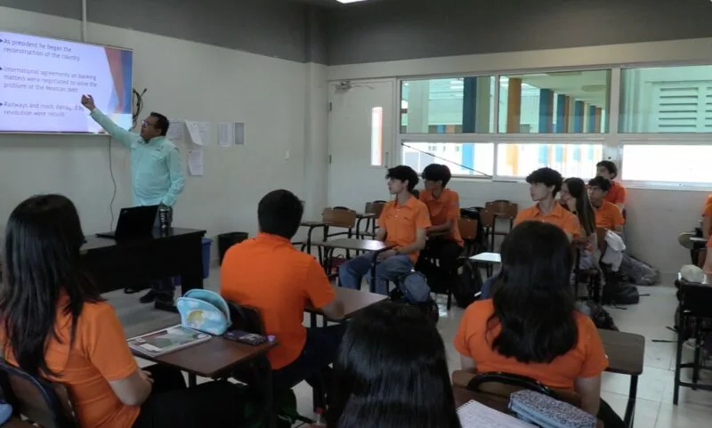 Mencionó que el programa bilingüe representa una de las principales fortalezas de la escuela, al permitir que los jóvenes cursen diversas asignaturas en inglés, fomentando así sus competencias lingüísticas y académicas desde el nivel bachillerato.