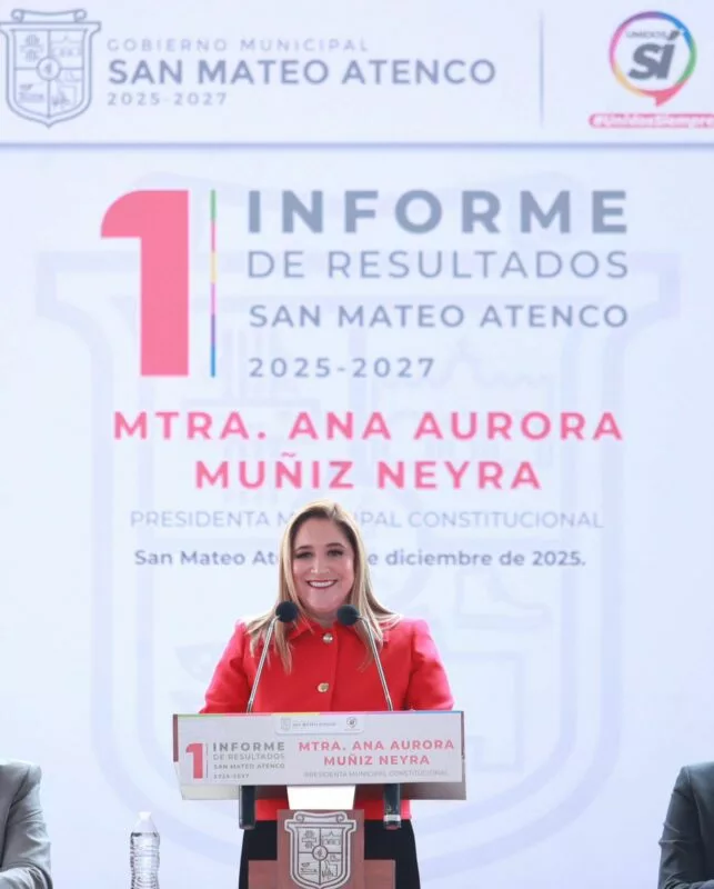 San Mateo Atenco, Estado de México, 1 de diciembre de 2025.- “Los atenquenses estamos resueltos a seguir la ruta del desarrollo, unidos y decididos a llevar a nuestro municipio hacia un futuro de igualdad y progreso, sin dejar a nadie atrás”, así lo afirmó la presidenta municipal Ana Aurora Muñiz Neyra, al rendir el Primer Informe de Resultados de la administración 2025-2027.