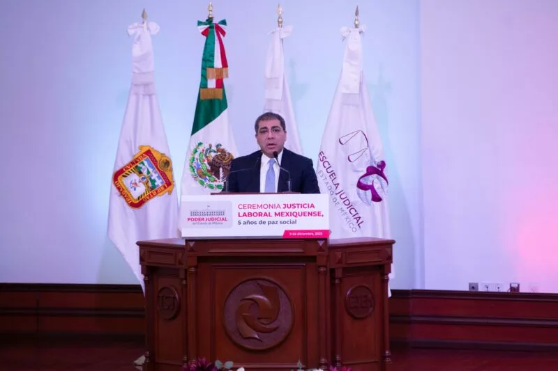 Toluca, Méx.; 9 de diciembre de 2025 .- A cinco años de que inició operaciones el modelo de justicia laboral en el Estado de México, la entidad mantiene un dato que habla por sí solo: ni una sola huelga registrada en todo el periodo, así lo destacó el Magistrado Edgar Hernán Mejía López, integrante del Órgano de Administración Judicial, durante la ceremonia “Justicia Laboral Mexiquense: cinco años de paz social” y en representación del Magistrado Héctor Macedo García, Presidente del Tribunal Superior de Justicia.