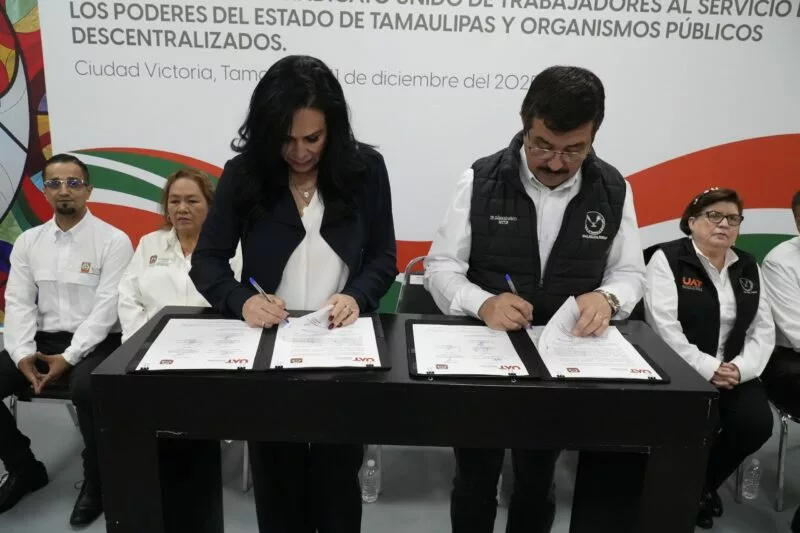 Ciudad Victoria, Tam.; 11 de diciembre de 2025.- La Universidad Autónoma de Tamaulipas (UAT) y el Sindicato Único de Trabajadores al Servicio de los Poderes del Estado de Tamaulipas y Organismos Públicos Descentralizados (SUTSPET) formalizaron la firma de un Convenio Marco de Colaboración que establece un amplio esquema de becas, capacitación y apoyos educativos en beneficio de trabajadores sindicalizados y sus hijos.