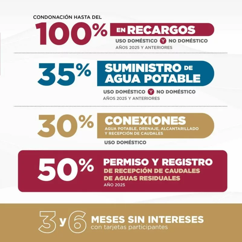Los usuarios podrán acceder hasta el 100% de descuento en recargos correspondientes al ejercicio 2025 y anteriores; 35% de bonificación en el suministro de agua potable; 30% en conexiones nuevas; así como 50% en el permiso y registro de recepción de caudales de aguas residuales, además se ofrece la posibilidad de realizar el pago a tres y seis meses sin intereses con tarjetas participantes.