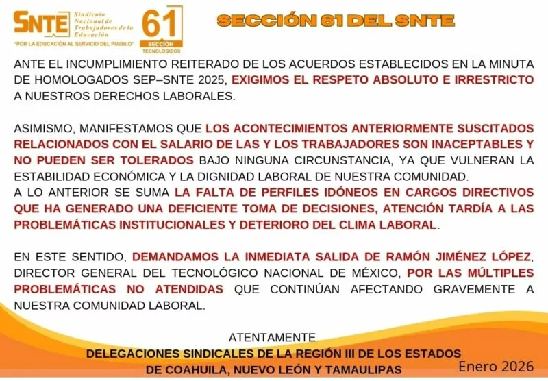 Finalmente, las delegaciones sindicales de la Región III, que integran a los estados de Coahuila, Nuevo León y Tamaulipas, reiteraron su llamado a las autoridades educativas federales para que atiendan de manera urgente las demandas del gremio, privilegiando el diálogo, el respeto a los acuerdos firmados y la defensa de los derechos laborales del personal del TecNM.