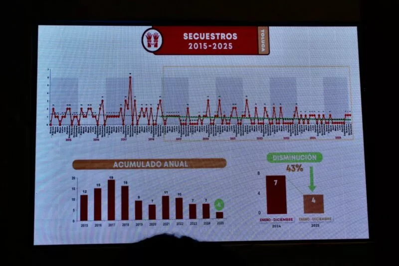 Durante la conferencia La Toluqueña, el alcalde detalló que el homicidio doloso cerró con 27 casos, logrando una reducción del 35.71%, mientras que el secuestro descendió un 43% con solo cuatro incidentes reportados. Moreno Bastida subrayó que, tras 13 meses consecutivos a la baja, el robo de vehículos mostró una de las caídas más significativas del país con un 56.09% menos, seguido por la extorsión, que disminuyó un 46.45%.