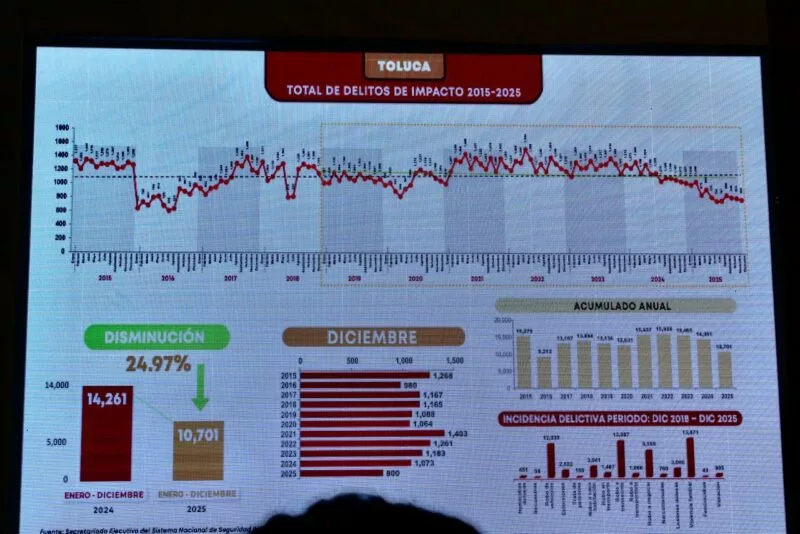 Toluca, Estado de México, 21 de enero de 2026.- Por primera vez desde 2015, Toluca alcanzó una tendencia a la baja generalizada de 24.97% en delitos de alto impacto, lo que sitúa a la capital mexiquense con indicadores de seguridad destacados a nivel nacional, informó el Presidente Municipal, Ricardo Moreno.