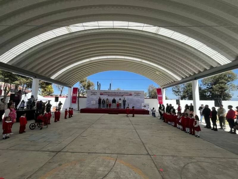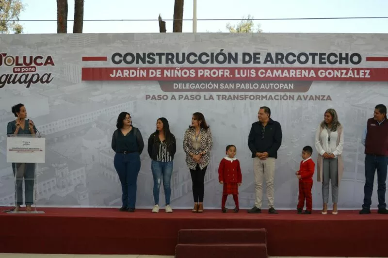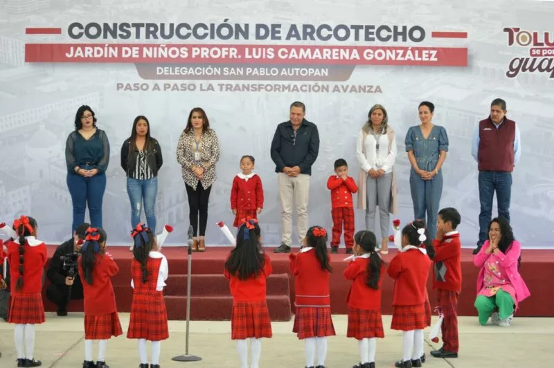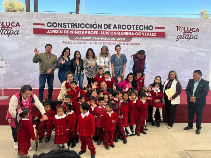 Toluca, Estado de México, 19 de febrero.- Con el objetivo de brindar mejores condiciones para el desarrollo académico y recreativo de la niñez, el presidente municipal de Toluca, Ricardo Moreno Bastida, encabezó la entrega del arco techo en el Jardín de Niños “Profr. Luis Camarena González”, ubicado en la delegación San Pablo Autopan, obra que beneficiará directamente a 59 alumnos y al personal docente.