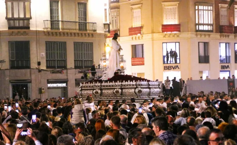 El viernes, la ciudad cambia el estruendo por el recogimiento absoluto con el Sepulcro. Finalmente, la orden de los Servitas recorre las calles en penumbra; a su paso, las luces de la ciudad se apagan por completo, dejando que solo el sonido de las horquillas de los portadores rompa el silencio de la noche malagueña.