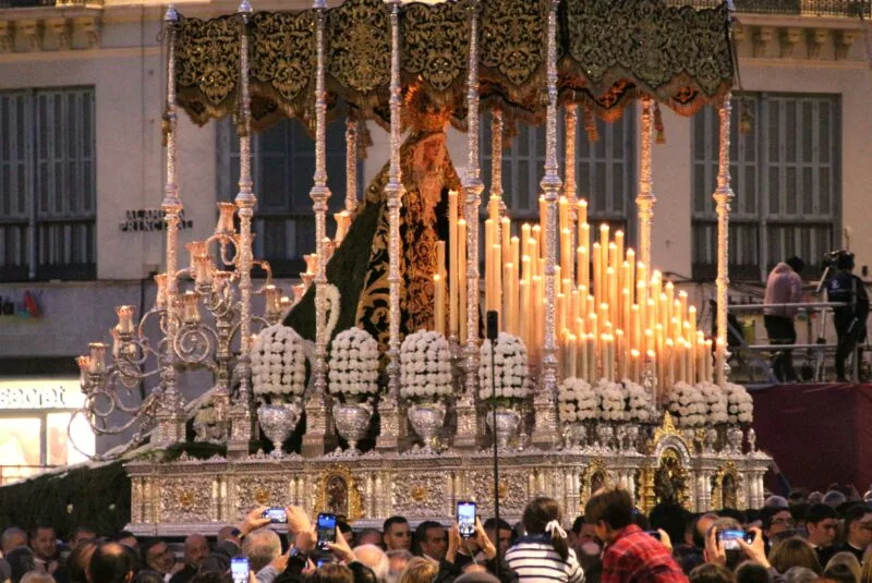 A diferencia de otras ciudades, en Málaga la escala de tamaño en sus tronos es colosal. Además que cada cofradía pone en la calle a centenares de nazarenos que portan sus capirotes (el capuchón cónico) del color distintivo de su hermandad, creando largas filas de luz y color.
