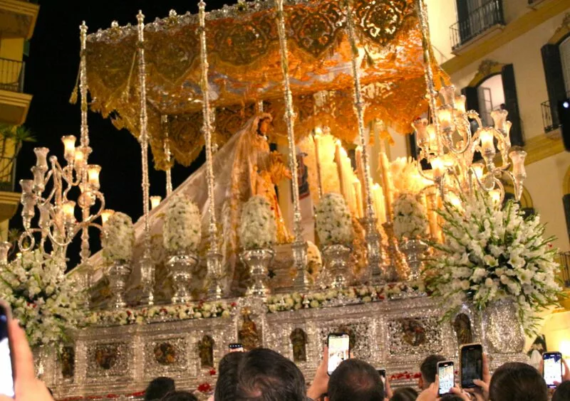 Otra de las hermandades es la de los Gitanos, cuyos nazarenos caminan con el rostro cubierto, sin los tradicionales capirotes. Al llegar el Martes Santo, además de la popular «Novia de Málaga» (el Rocío), ocurre un hito artístico: la procesión de las Penas. Su titular, María Santísima de las Penas, luce un impresionante manto confeccionado íntegramente con flores naturales. Esta obra efímera es realizada cada año por un equipo especializado de jardineros del Ayuntamiento de Málaga, quienes diseñan un tapiz floral único para la ocasión.