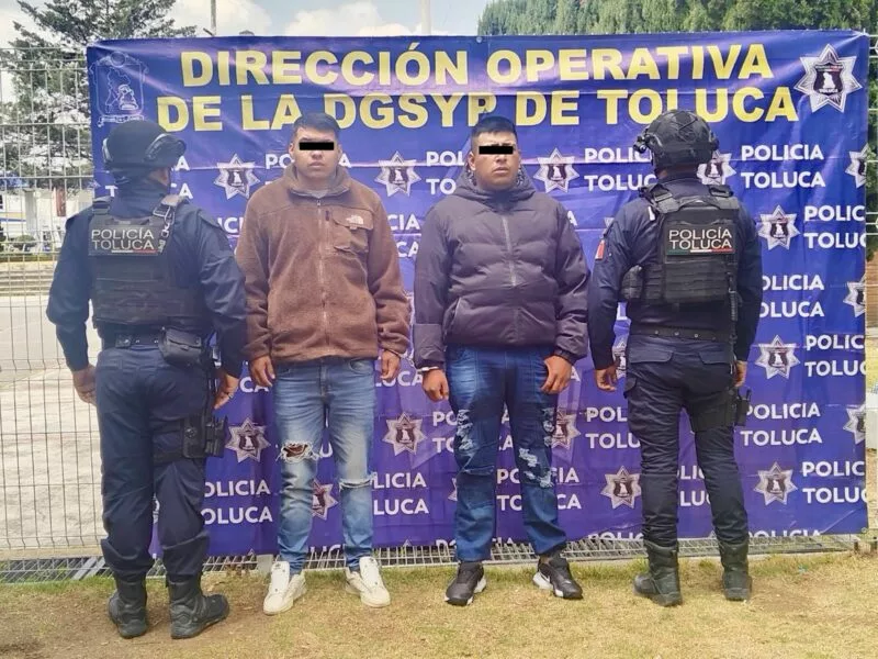 La detención ocurrió en el cruce de Avenida de los Maestros y Paseo Matlatzincas, cuando los policías detectaron a dos sujetos a bordo de una motocicleta Dominar 400 sin placas, quienes al notar la presencia policial intentaron escapar.