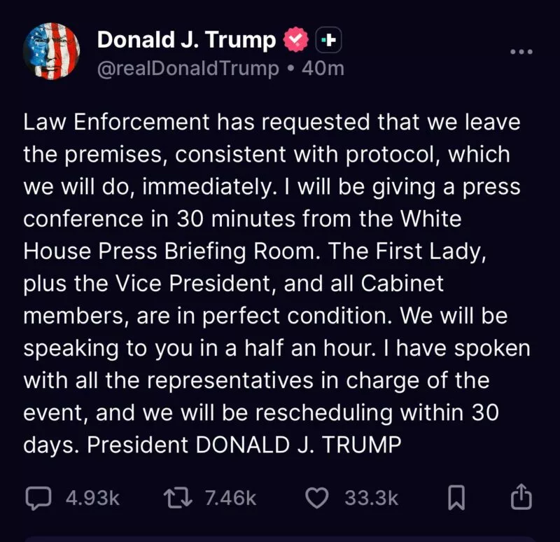 Esta noche, el presidente de los Estados Unidos, Donald J. Triunfo, fue evacuado de una cena con corresponsales extranjeros por elementos del Servicio Secreto. La evacuación se produjo tras reportes de disparos en las cercanías, lo que llevó a las autoridades a activar protocolos de seguridad.
