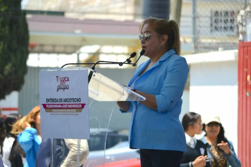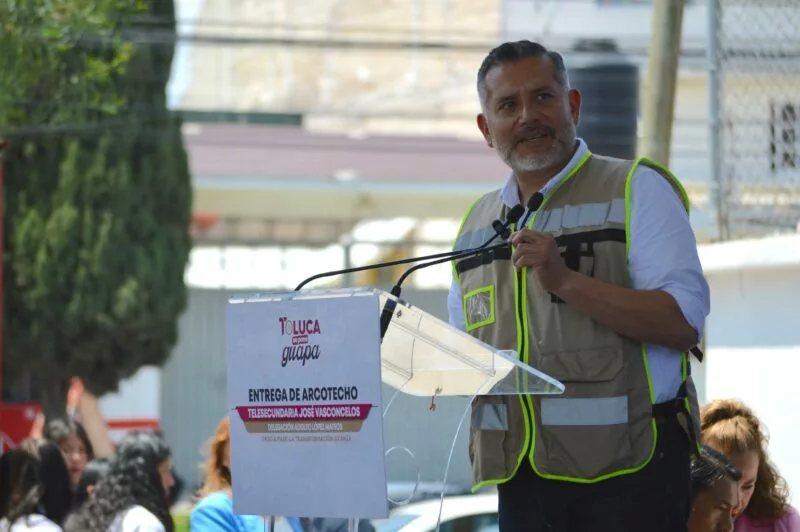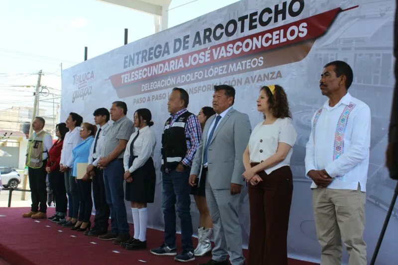 Toluca, Estado de México, 27 de abril de 2026.- El presidente municipal de Toluca, Ricardo Moreno Bastida, encabezó la entrega de un arcotecho en la Telesecundaria José Vasconcelos, obra que beneficiará directamente a 130 estudiantes de la delegación Adolfo López Mateos y que representó una inversión de 1 millón 980 mil 583 pesos.