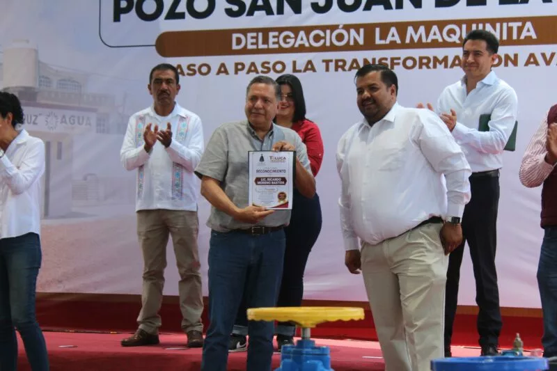 Toluca, Estado de México, 27 de abril de 2026.- El presidente municipal de Toluca, Ricardo Moreno Bastida, encabezó la entrega de la rehabilitación del pozo profundo San Juan de la Cruz, ubicado en la delegación La Maquinita, obra que beneficiará a 6 mil 755 viviendas y a más de 20 mil habitantes de la zona.