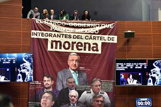 Bancada del PRI coloca manta en el pleno del Senado titulada «Los Narcos de Morena»